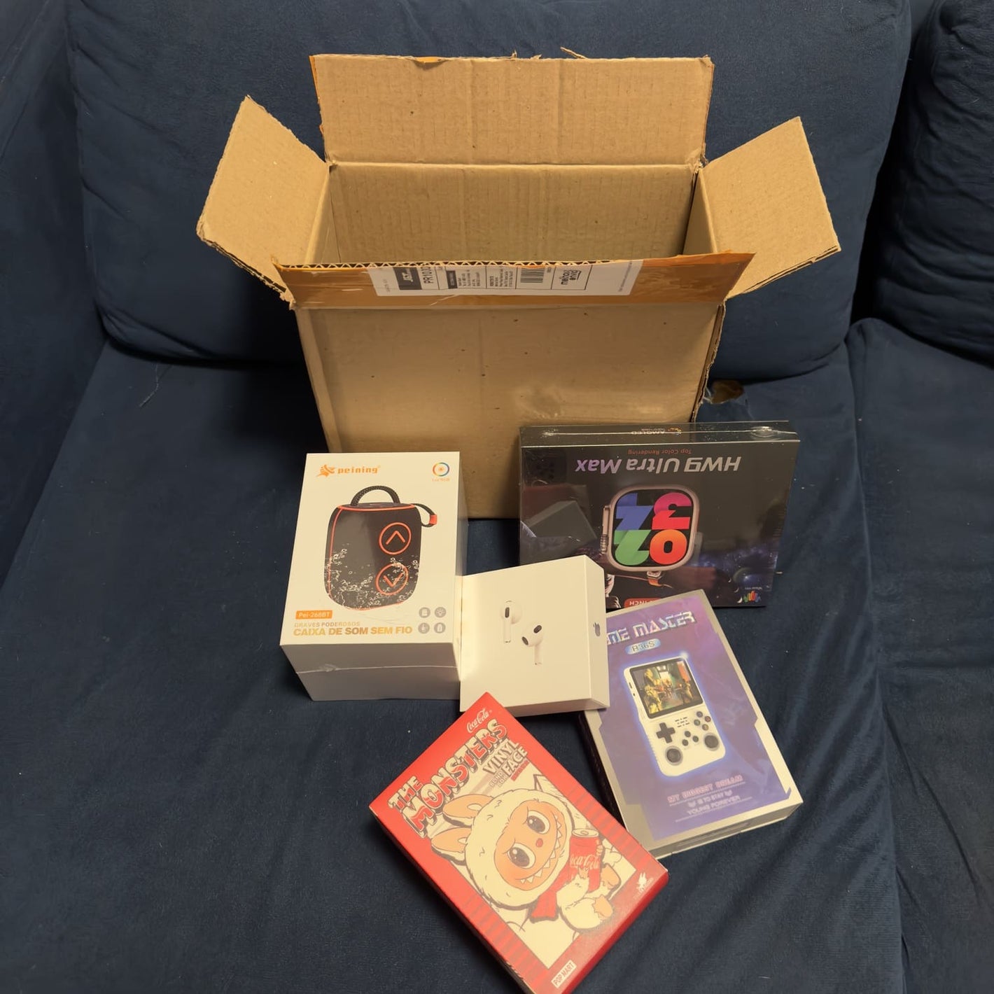 Entre os itens que podem aparecer nas caixas, temos produtos da maça. No entanto, vale ressaltar que esses itens são produtos premium de alguns produtos da marca. Fones de ouvido, relógios e carregadores por indução da maça estão entre os produtos que você pode receber. Essas produtos são de alta qualidade, projetadas para oferecer uma experiência bastante semelhante aos modelos genuínos da maça, com design e funcionalidade extremamente fiéis. Porém, não se trata de produtos genuínos da maça, mas sim de produtos premium, com ótimo custo-benefício, para quem busca qualidade e um preço mais acessível.